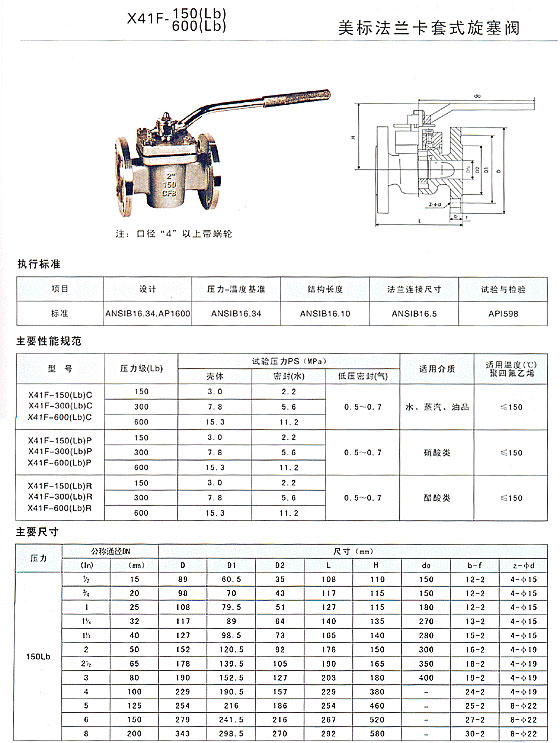 工稱壓力:150Lb、300Lb、600Lb; 適用溫度:≤ 150°C; 適用介質:水蒸汽、天然汽、油品,P:銷酸類,R:醋酸類; 材質:體蓋:WCB、CFB、CF8M,塞子:2Cr13、304、316,填料、墊片、襯套PTFE(聚四氧乙烯)