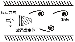 在測(cè)量管中垂直插入一個(gè)柱狀物時(shí),流體通過(guò)柱狀物兩側(cè)就交替地產(chǎn)生有規(guī)則的旋渦(如圖所示),這種旋渦列被稱(chēng)為卡門(mén)渦街。卡門(mén)渦街的釋放頻率與流體的流動(dòng)速度及柱狀物的寬度有關(guān),可用下式表示: |