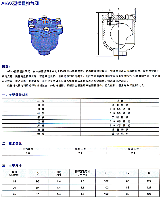 APVX自動排氣閥,在一般情況下,水中約含2V0L%的溶解空氣,在輸水過程中,這些空氣由水中不斷釋放出來,聚集在管線的高點處,形成空氣袋(AIR POCKET),使輸水變得困難,系統(tǒng)輸水能力可因此下降約5-15%。此微量排氣閥主要功能就是排除這2VOL%的溶解空氣,并適合裝置于高層建筑,廠區(qū)內(nèi)配管,小型泵站用以保護或改善系統(tǒng)的輸水功率及節(jié)約能源。