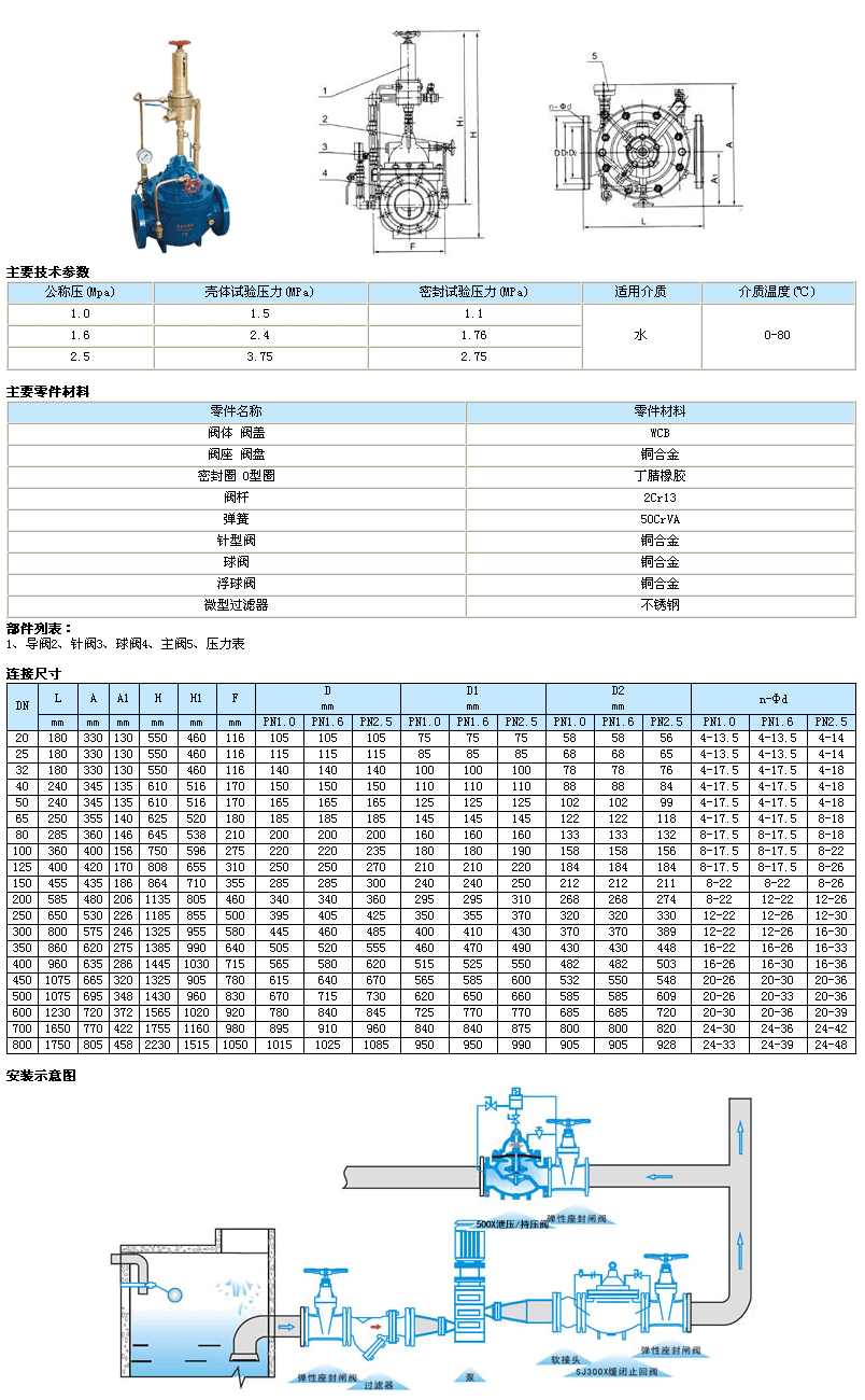 500X泄壓/持壓閥由主閥、泄壓/持壓導閥針閥、球閥、微形過濾器和壓力表組成水力控制接管系統(tǒng)。利用水力自動操作,即可以作泄壓閥用又可作持壓閥用。作泄壓閥用時,可維持供水路壓力在設定的安全值之下;做持壓閥用,可維持主閥上游水壓在設定值之上,保持主閥上游供水壓力。本產(chǎn)品利用水力自力控制,不需要其它裝置和能源,保養(yǎng)簡便,一閥多用。本系列閥門產(chǎn)品廣泛用于高層建筑、生活區(qū)等供水管網(wǎng)系統(tǒng)及城市供水工程。1、作泄壓閥:當泄壓/持壓導閥調(diào)整為泄壓狀態(tài)時,水通過針閥、主閥控制室、球閥A、泄壓/持壓導閥、球閥B流向出口,此時主閥處于開啟狀態(tài)。當進口壓力超過泄壓/持壓導閥設定的安全值時,泄壓導閥會自動開啟,通過球閥C放出部分水,使管路泄壓。當壓力恢復到安全值時,泄壓閥自動關閉。作泄壓閥時,各球閥常開。2、作持壓閥:當泄壓/持壓導閥調(diào)整為持壓狀態(tài)時,只要主閥進口水壓低于導閥設定值,導閥即關閉。主要控制室升壓,主閥關閉。當主閥上游供水壓力超過導閥設定壓力時,持壓導閥才能打開,控制室的水經(jīng)球閥排至出口,控制室降壓主閥開啟,開始供水,即保持了上游水壓。作持壓閥用時,球閥C常閉或用絲堵?lián)Q下。 |